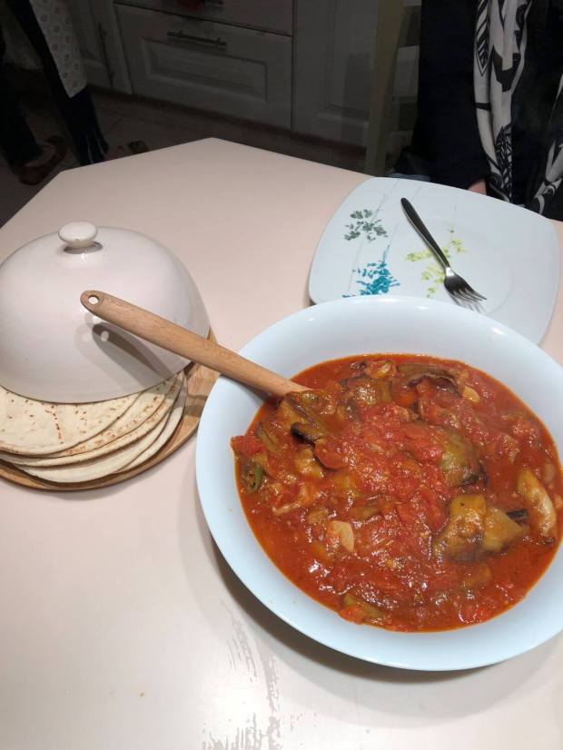 Nachdem die jordanische Küche so köstlich ist, lernt man am besten gleich selbst einige Rezepte. Gut, dass meine liebe Freundin M. die Idee hatte einen Kochkurs vor Ort zu besuchen. So waren wir an einem Abend nicht im Restaurant sondern haben selbst Hand an den Kochlöffel gelegt, und zwar zu Hause bei Kochlehrerin Dima. In einer kleinen Runde von 5 Personen haben wir ein 3-gängiges vegetarisches Menü gekocht – mit einem typischen Fattoush-Salat, einem Rote Rüben Salat mit Tahin-Dressing, einem Tomaten-Melanzani-Eintopf und einem süßen Grieskuchen. Dank der professionellen Anleitung von Dima sind die Gerichte richtig gut gelungen – und wieder war unser Bauch mehr als gut gefüllt. 😀