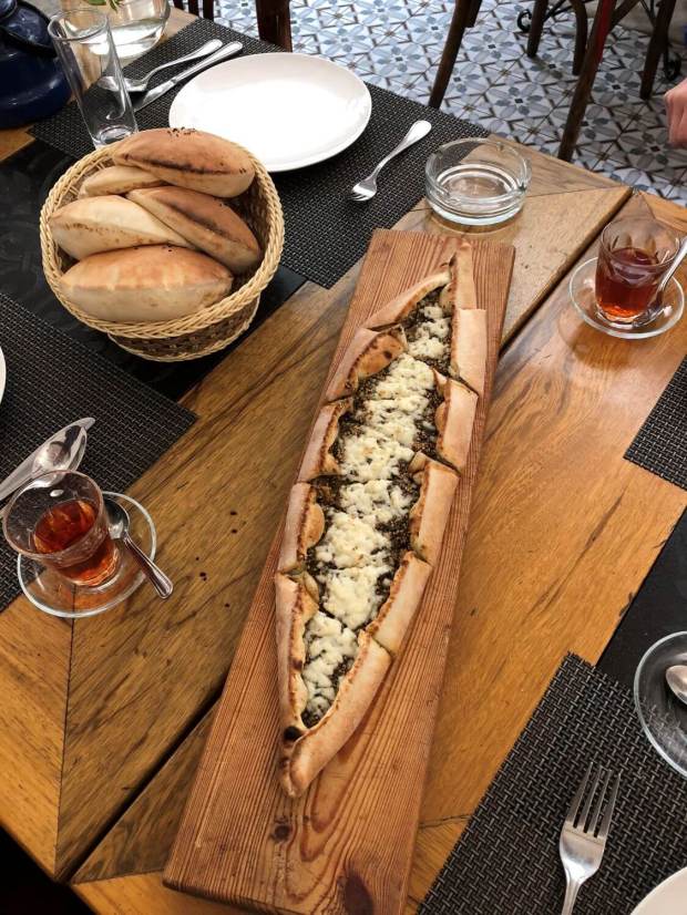 Die kulinarische Entdeckungsreise Jordaniens begann für uns schon beim Frühstück. Wir waren gleich zweimal im Rosa Damascena, denn dort gibt es eindeutig die besten Manaeesh aller Zeiten – oder zumindest die besten die ich jemals gegessen habe. Ein lockerer Teigfladen belegt mit reichlich Zatar, Olivenöl und Halloumi frisch aus dem Ofen. Es gibt kaum etwas Köstlicheres! Natürlich muss man anschließend noch eine Süße Variante kosten – am besten jene mit Arabic Cream (was auch immer das genau ist – es ist köstlich). Danach kann man sich zwar nicht mehr bewegen, aber es lohnt sich. 😀