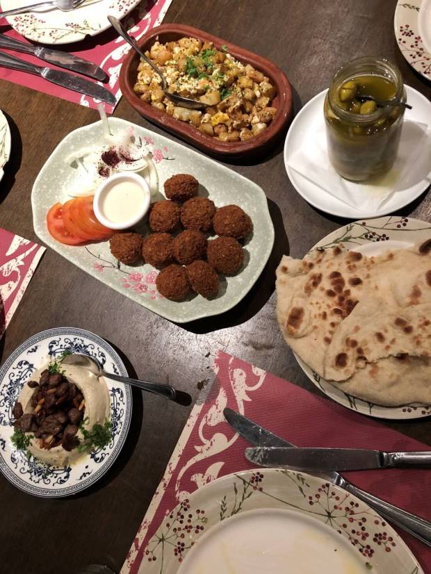 Wenn man die Unmengen an Frühstück und den Nachmittagssnack wieder verdaut hat, wartet schon das nächste kulinarische Highlight, das Abendessen. Besonders gut hat es uns im Sufra geschmeckt. In dem wunderschön eingerichteten Lokal gibt es neben typisch jordanischen Hauptgerichten (zum Beispiel Magloubeh – Reis mit Melanzani und Fleisch) unzählige Vorspeisen und kleine Gerichte durch die wir uns durchgekostet haben. Hummus muss natürlich sein, Falafel ebenso und dann noch die ein oder andere Köstlichkeit gemeinsam mit dem frisch gebackenen Fladenbrot. Dazu eine hausgemachte Minz-Limo. Und schon wieder „rollten“ wir mit gut gefüllten Bäuchen aus dem Lokal.